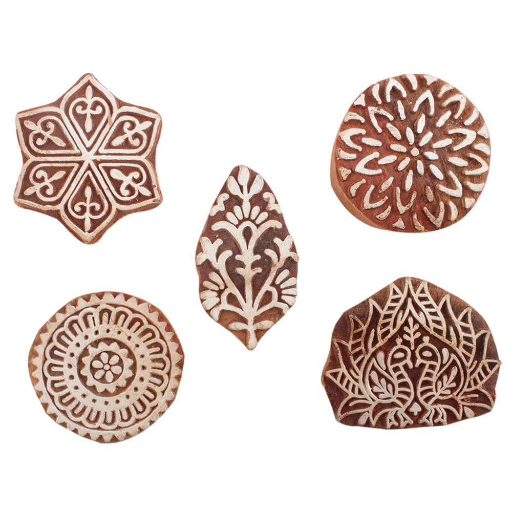Set of 5 Piece New Mix Wooden Printing Blocks. Ideal for use on Fabric, Paper, Canvas, etc. These Blocks can be use to Print with Oil Colors, Fabric Colors, Water Colors, Acrylic Colors and Vegetable Colors.