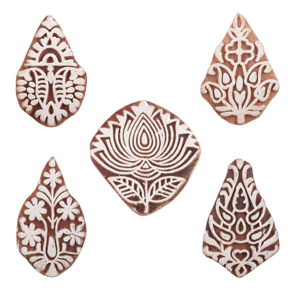 Set of 5 Piece New Mix Wooden Printing Blocks. Ideal for use on Fabric, Paper, Canvas, etc. These Blocks can be use to Print with Oil Colors, Fabric Colors, Water Colors, Acrylic Colors and Vegetable Colors.