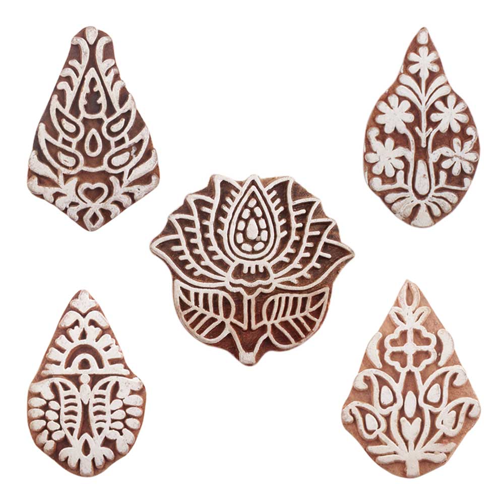 Set of 5 Piece New Mix Wooden Printing Blocks. Ideal for use on Fabric, Paper, Canvas, etc. These Blocks can be use to Print with Oil Colors, Fabric Colors, Water Colors, Acrylic Colors and Vegetable Colors.