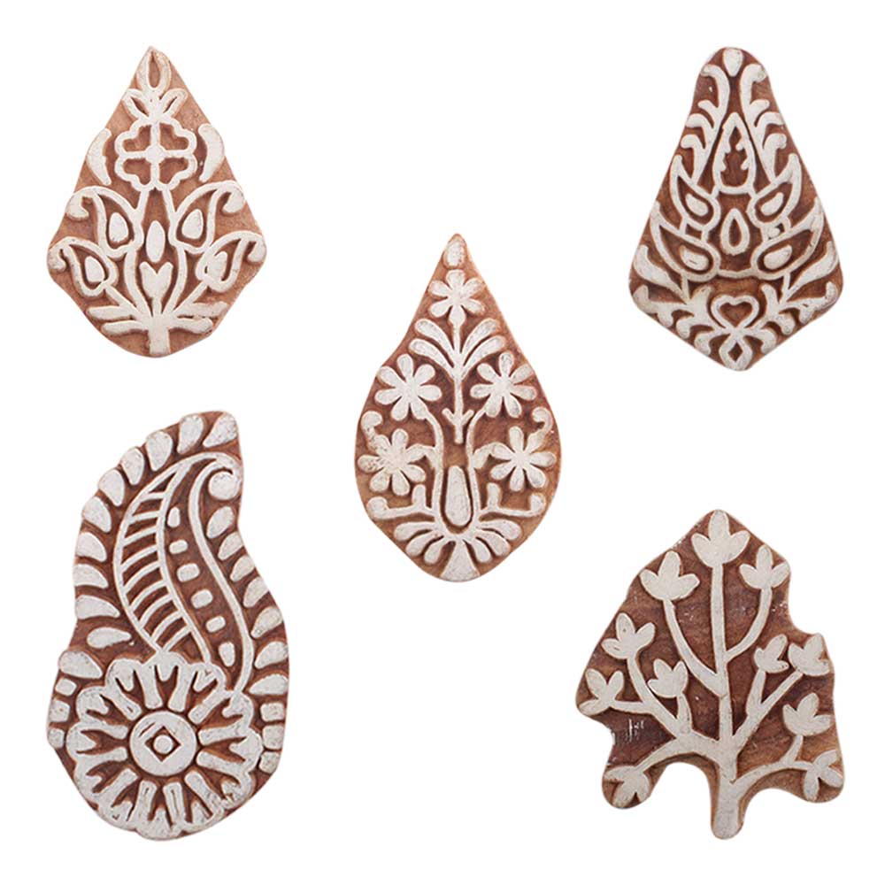 Set of 5 Piece New Mix Wooden Printing Blocks. Ideal for use on Fabric, Paper, Canvas, etc. These Blocks can be use to Print with Oil Colors, Fabric Colors, Water Colors, Acrylic Colors and Vegetable Colors.