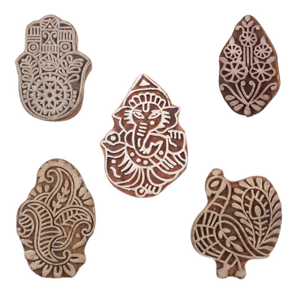 Set of 5 Piece New Mix Wooden Printing Blocks. Ideal for use on Fabric, Paper, Canvas, etc. These Blocks can be use to Print with Oil Colors, Fabric Colors, Water Colors, Acrylic Colors and Vegetable Colors.
