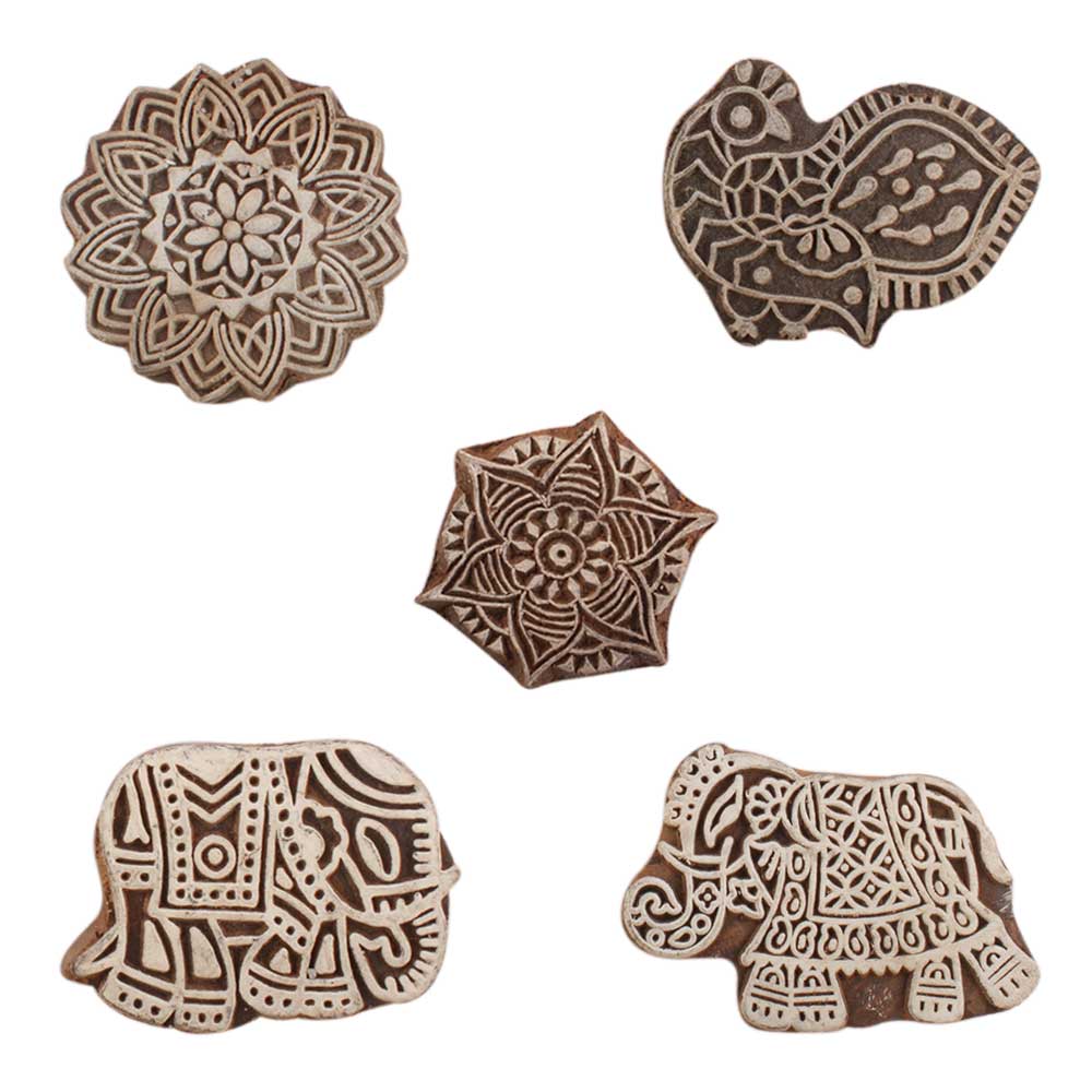 Set of 5 Piece New Mix Wooden Printing Blocks. Ideal for use on Fabric, Paper, Canvas, etc. These Blocks can be use to Print with Oil Colors, Fabric Colors, Water Colors, Acrylic Colors and Vegetable Colors.