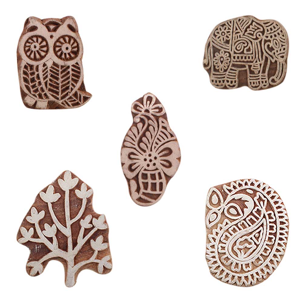 Set of 5 Piece New Mix Wooden Printing Blocks. Ideal for use on Fabric, Paper, Canvas, etc. These Blocks can be use to Print with Oil Colors, Fabric Colors, Water Colors, Acrylic Colors and Vegetable Colors.