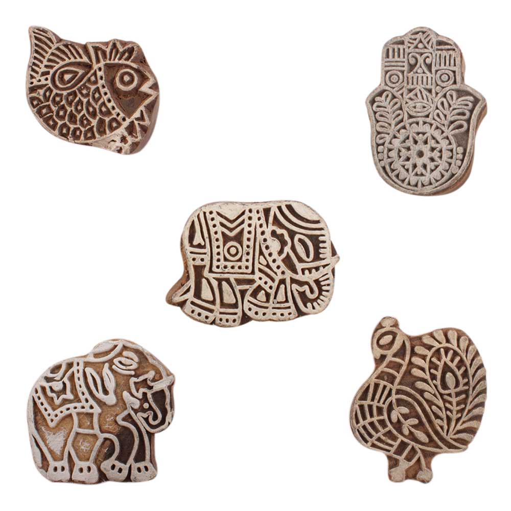 Set of 5 Piece New Mix Wooden Printing Blocks. Ideal for use on Fabric, Paper, Canvas, etc. These Blocks can be use to Print with Oil Colors, Fabric Colors, Water Colors, Acrylic Colors and Vegetable Colors.