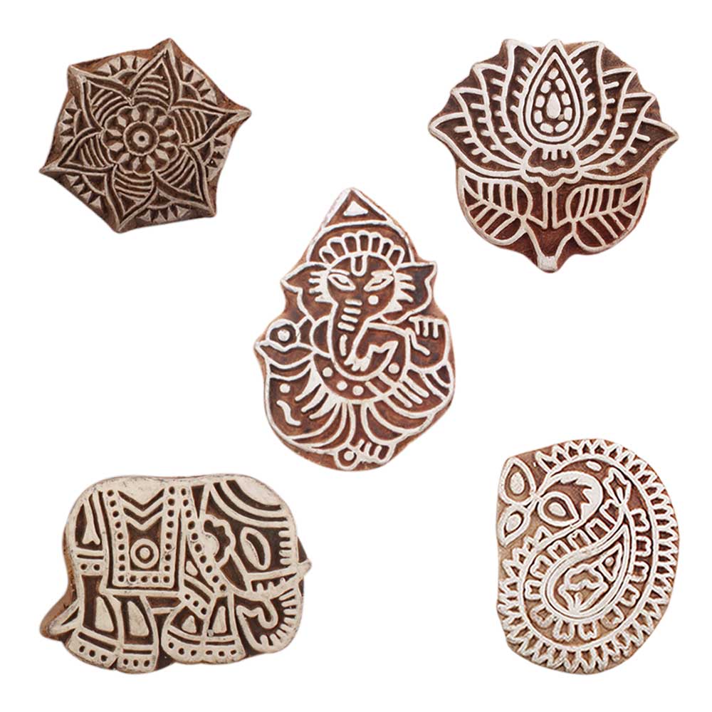 Set of 4 Piece New Mix Wooden Printing Blocks. Ideal for use on Fabric, Paper, Canvas, etc. These Blocks can be use to Print with Oil Colors, Fabric Colors, Water Colors, Acrylic Colors and Vegetable Colors.