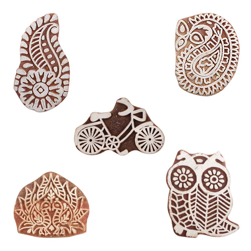 Set of 5 Piece New Mix Wooden Printing Blocks. Ideal for use on Fabric, Paper, Canvas, etc. These Blocks can be use to Print with Oil Colors, Fabric Colors, Water Colors, Acrylic Colors and Vegetable Colors.