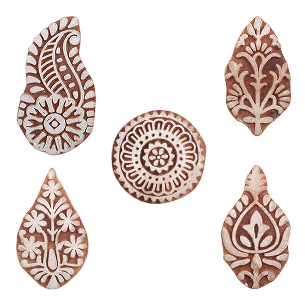 Set of 5 Piece New Mix Wooden Printing Blocks. Ideal for use on Fabric, Paper, Canvas, etc. These Blocks can be use to Print with Oil Colors, Fabric Colors, Water Colors, Acrylic Colors and Vegetable Colors.