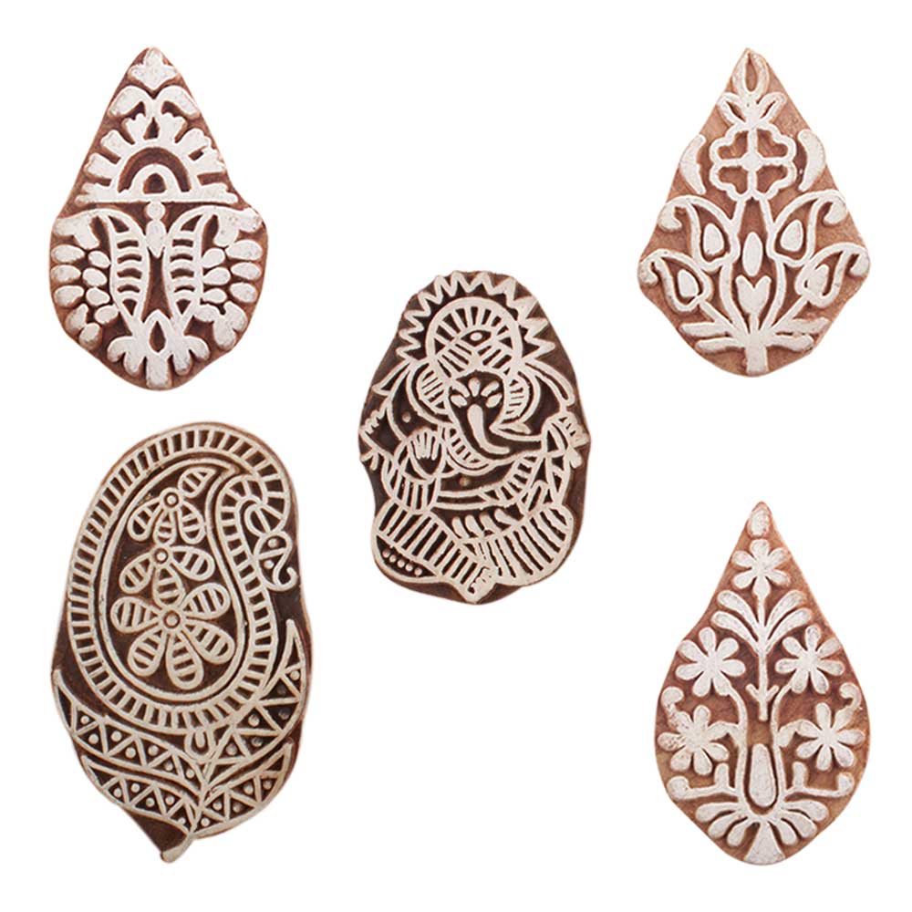 Set of 5 Piece New Mix Wooden Printing Blocks. Ideal for use on Fabric, Paper, Canvas, etc. These Blocks can be use to Print with Oil Colors, Fabric Colors, Water Colors, Acrylic Colors and Vegetable Colors.
