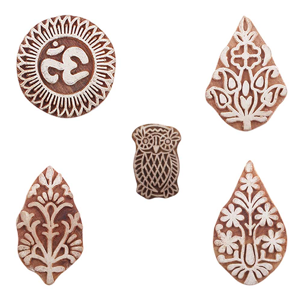 Set of 5 Piece New Mix Wooden Printing Blocks. Ideal for use on Fabric, Paper, Canvas, etc. These Blocks can be use to Print with Oil Colors, Fabric Colors, Water Colors, Acrylic Colors and Vegetable Colors.