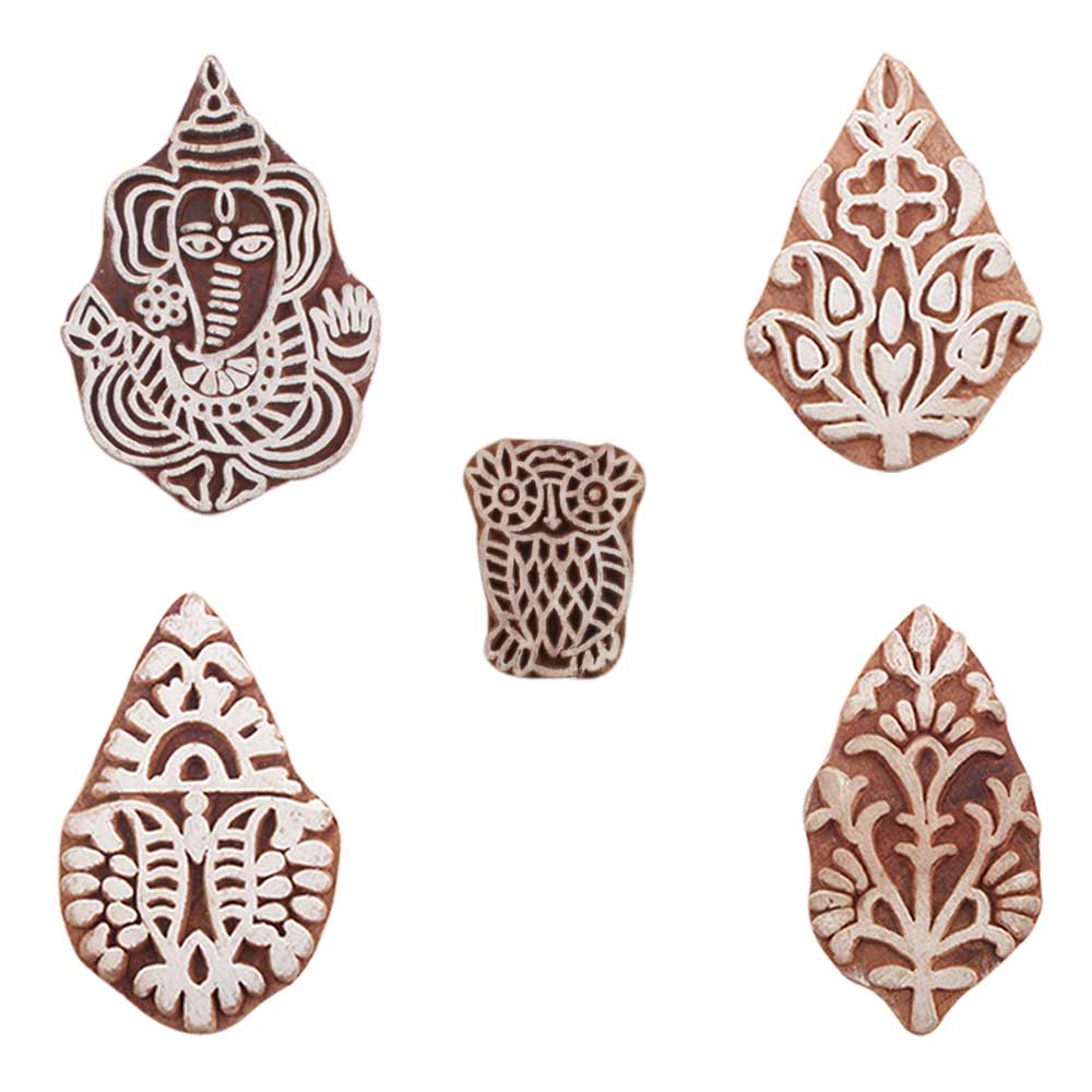 Set of 5 Piece New Mix Wooden Printing Blocks. Ideal for use on Fabric, Paper, Canvas, etc. These Blocks can be use to Print with Oil Colors, Fabric Colors, Water Colors, Acrylic Colors and Vegetable Colors.