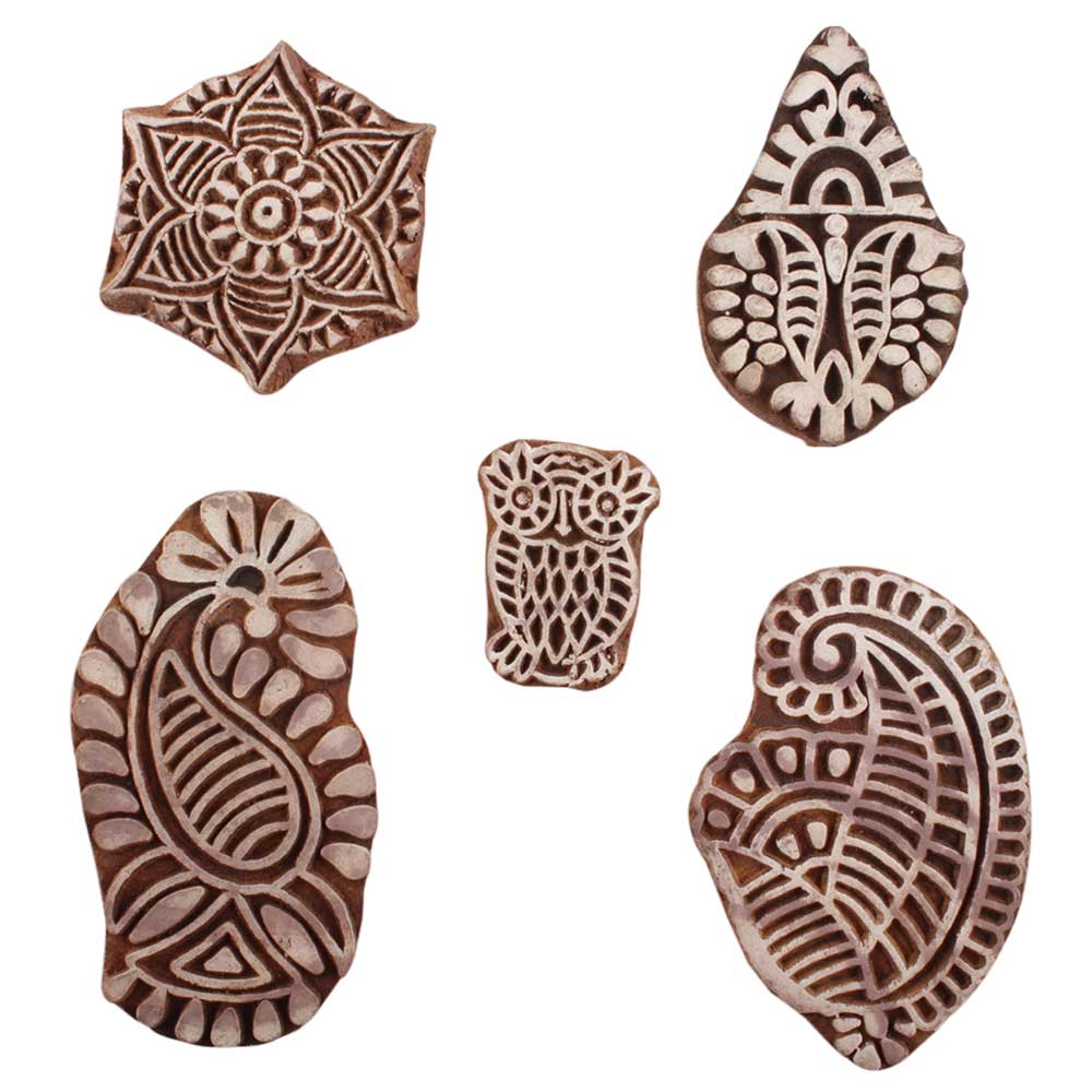 Set of 5 Piece New Mix Wooden Printing Blocks. Ideal for use on Fabric, Paper, Canvas, etc. These Blocks can be use to Print with Oil Colors, Fabric Colors, Water Colors, Acrylic Colors and Vegetable Colors.