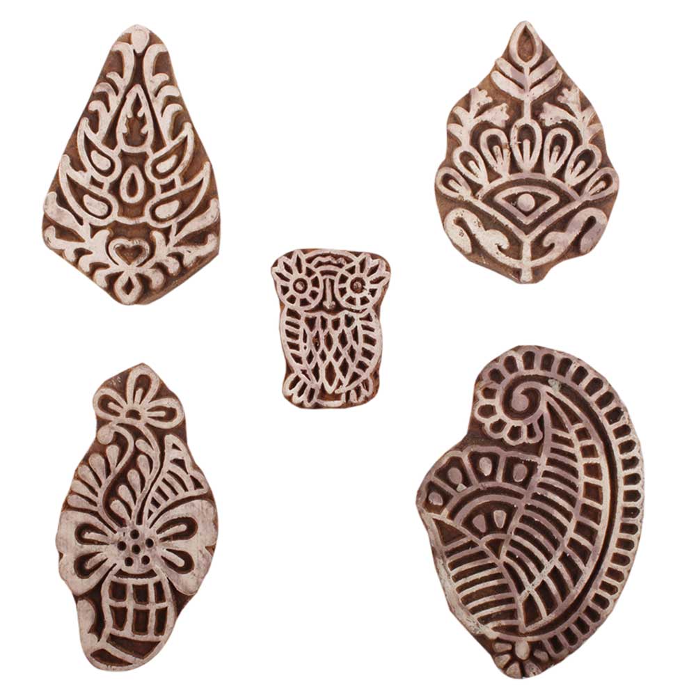 Set of 5 Piece New Mix Wooden Printing Blocks. Ideal for use on Fabric, Paper, Canvas, etc. These Blocks can be use to Print with Oil Colors, Fabric Colors, Water Colors, Acrylic Colors and Vegetable Colors.