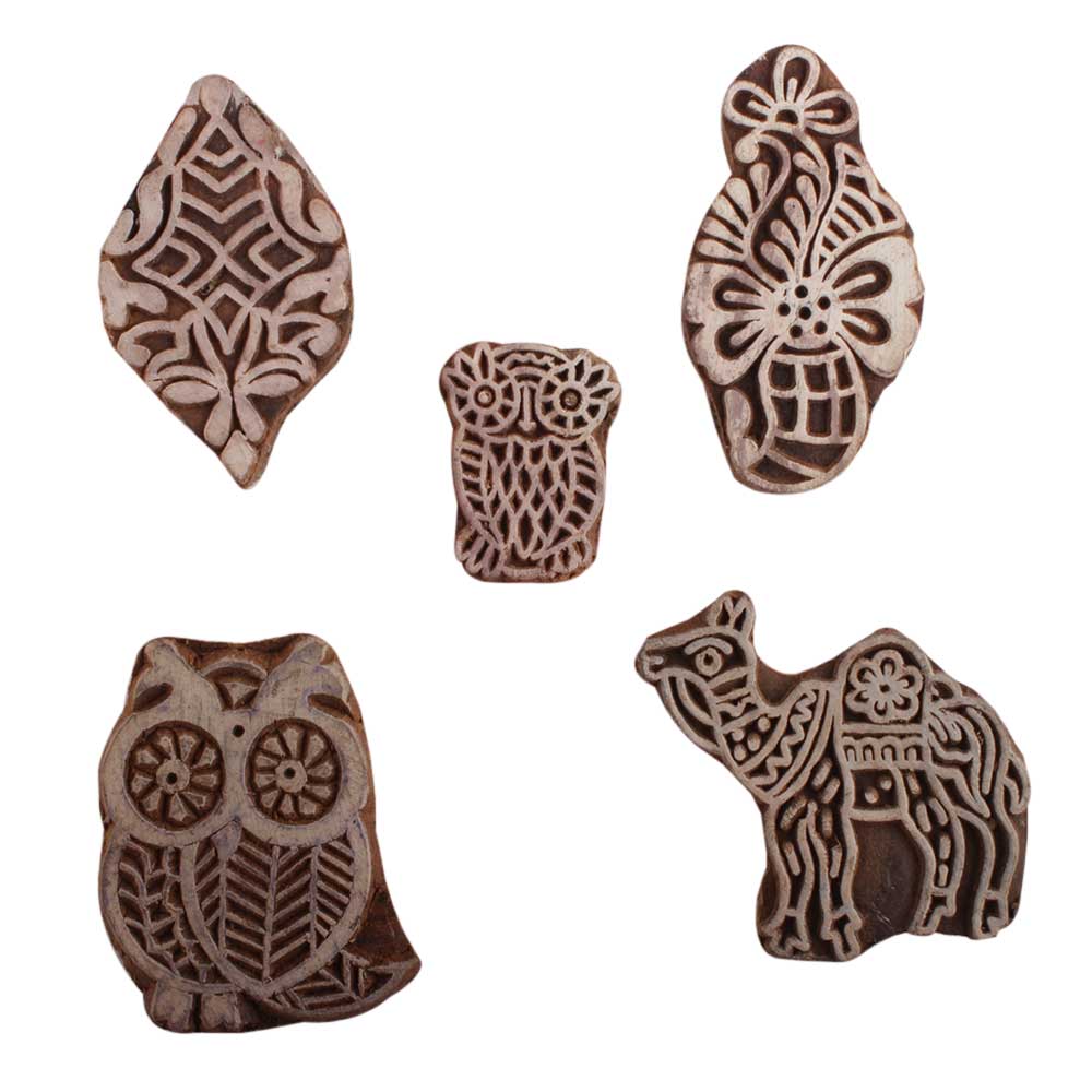 Set of 5 Piece New Mix Wooden Printing Blocks. Ideal for use on Fabric, Paper, Canvas, etc. These Blocks can be use to Print with Oil Colors, Fabric Colors, Water Colors, Acrylic Colors and Vegetable Colors.