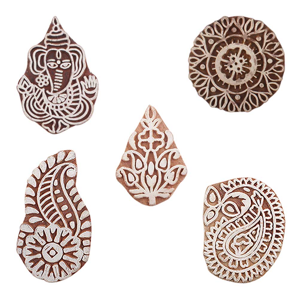 Set of 5 Piece New Mix Wooden Printing Blocks. Ideal for use on Fabric, Paper, Canvas, etc. These Blocks can be use to Print with Oil Colors, Fabric Colors, Water Colors, Acrylic Colors and Vegetable Colors.
