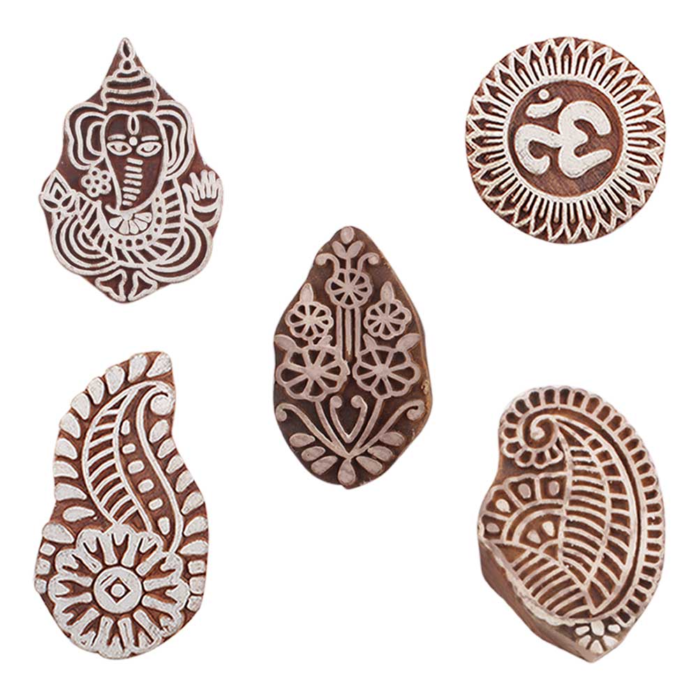 Set of 5 Piece New Mix Wooden Printing Blocks. Ideal for use on Fabric, Paper, Canvas, etc. These Blocks can be use to Print with Oil Colors, Fabric Colors, Water Colors, Acrylic Colors and Vegetable Colors.