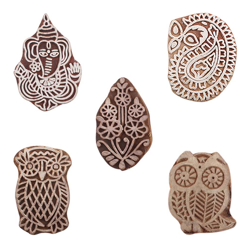 Set of 5 Piece New Mix Wooden Printing Blocks. Ideal for use on Fabric, Paper, Canvas, etc. These Blocks can be use to Print with Oil Colors, Fabric Colors, Water Colors, Acrylic Colors and Vegetable Colors.