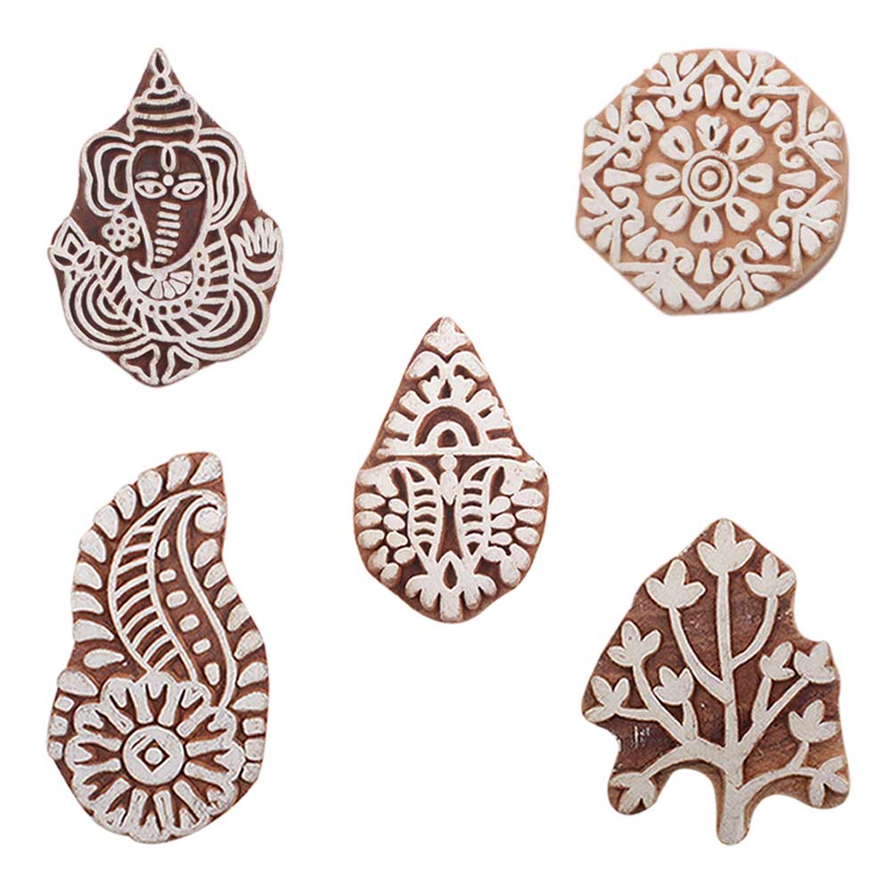 Set of 5 Piece New Mix Wooden Printing Blocks. Ideal for use on Fabric, Paper, Canvas, etc. These Blocks can be use to Print with Oil Colors, Fabric Colors, Water Colors, Acrylic Colors and Vegetable Colors.