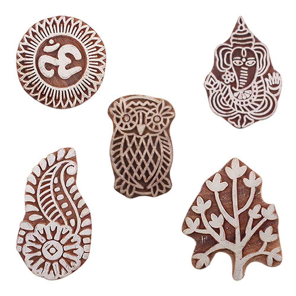 Set of 5 Piece New Mix Wooden Printing Blocks. Ideal for use on Fabric, Paper, Canvas, etc. These Blocks can be use to Print with Oil Colors, Fabric Colors, Water Colors, Acrylic Colors and Vegetable Colors.