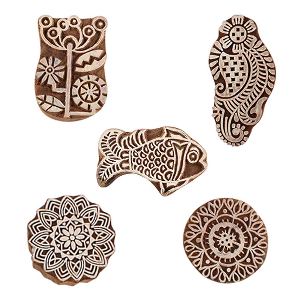 Set of 5 Piece New Mix Wooden Printing Blocks. Ideal for use on Fabric, Paper, Canvas, etc. These Blocks can be use to Print with Oil Colors, Fabric Colors, Water Colors, Acrylic Colors and Vegetable Colors.
