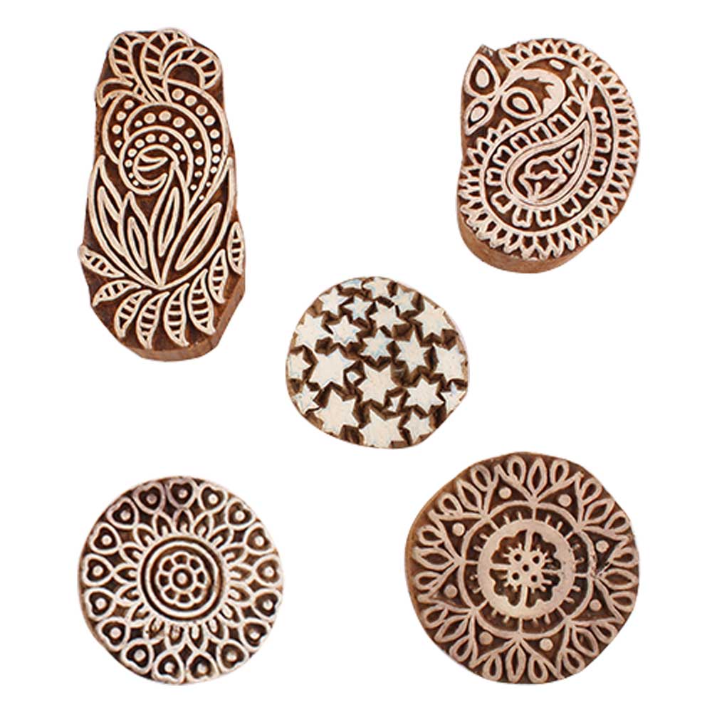 Set of 5 Piece New Mix Wooden Printing Blocks. Ideal for use on Fabric, Paper, Canvas, etc. These Blocks can be use to Print with Oil Colors, Fabric Colors, Water Colors, Acrylic Colors and Vegetable Colors.