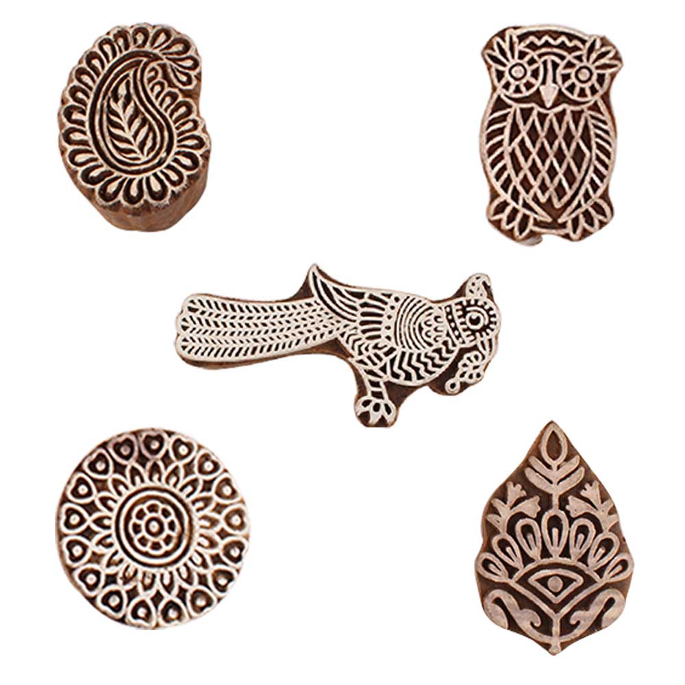 Set of 5 Piece New Mix Wooden Printing Blocks. Ideal for use on Fabric, Paper, Canvas, etc. These Blocks can be use to Print with Oil Colors, Fabric Colors, Water Colors, Acrylic Colors and Vegetable Colors.