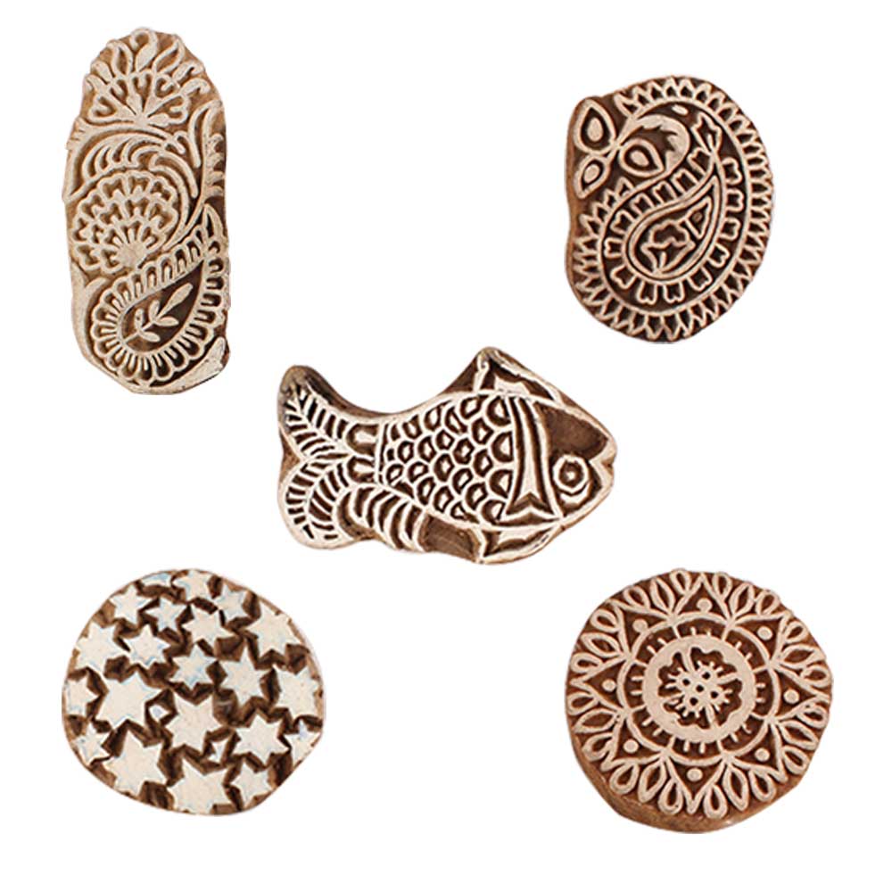 Set of 5 Piece New Mix Wooden Printing Blocks. Ideal for use on Fabric, Paper, Canvas, etc. These Blocks can be use to Print with Oil Colors, Fabric Colors, Water Colors, Acrylic Colors and Vegetable Colors.