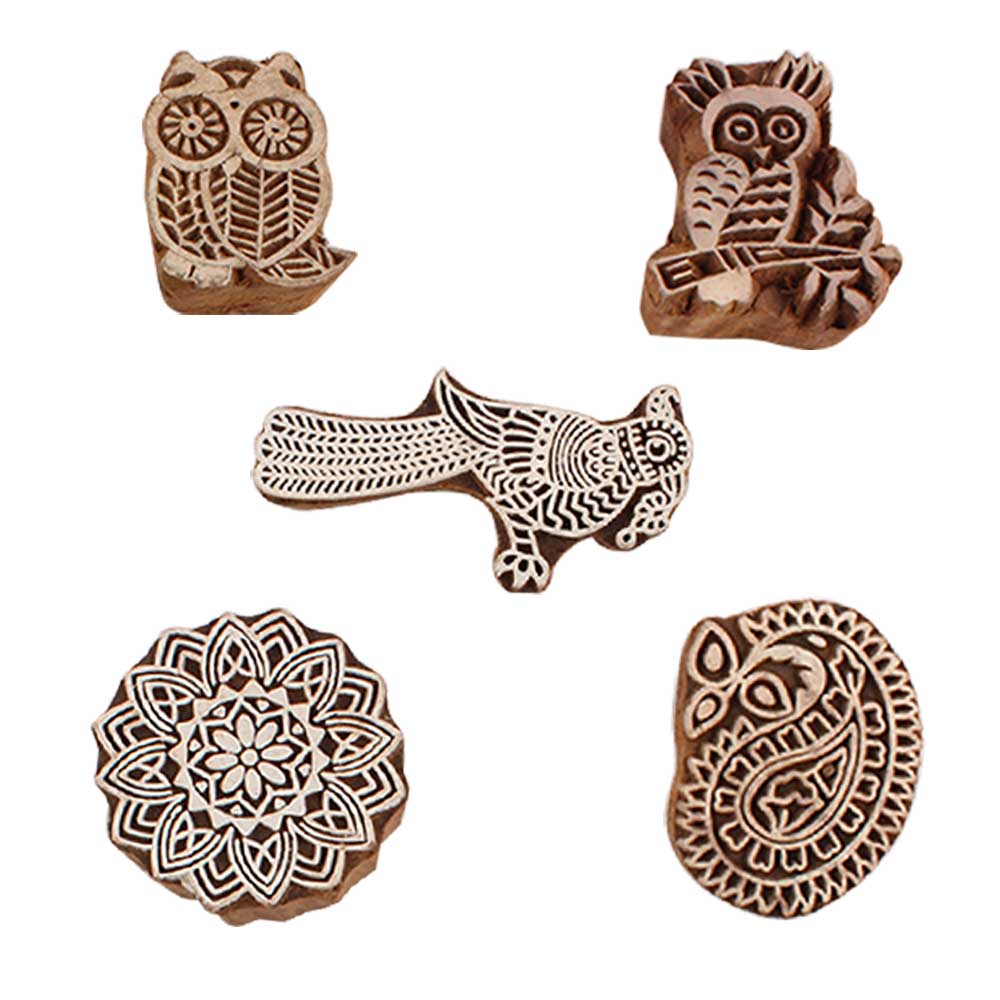 Set of 5 Piece New Mix Wooden Printing Blocks. Ideal for use on Fabric, Paper, Canvas, etc. These Blocks can be use to Print with Oil Colors, Fabric Colors, Water Colors, Acrylic Colors and Vegetable Colors.