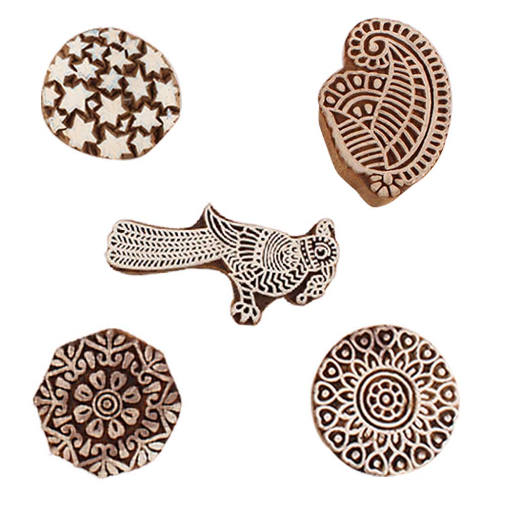 Set of 5 Piece New Mix Wooden Printing Blocks. Ideal for use on Fabric, Paper, Canvas, etc. These Blocks can be use to Print with Oil Colors, Fabric Colors, Water Colors, Acrylic Colors and Vegetable Colors.