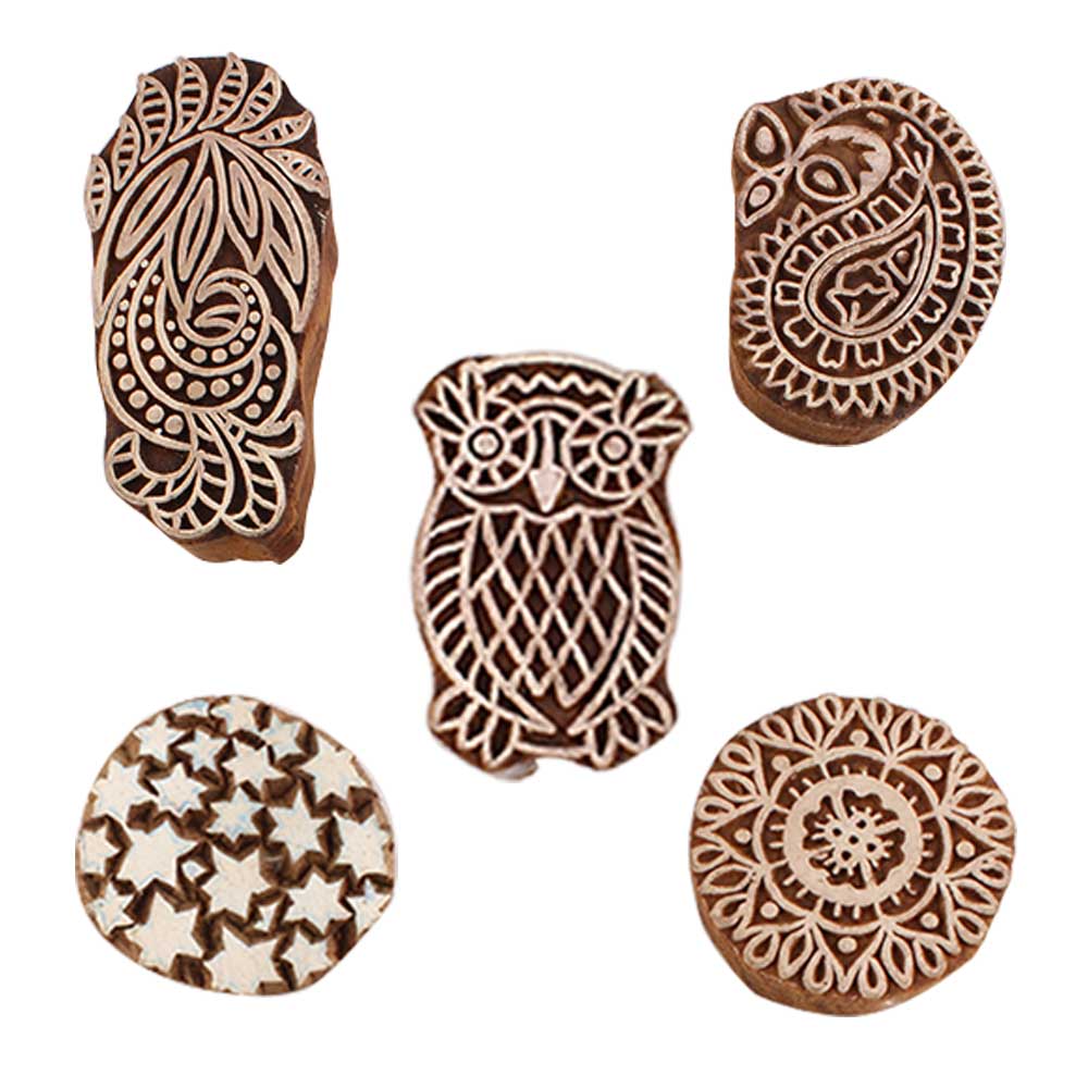 Set of 5 Piece New Mix Wooden Printing Blocks. Ideal for use on Fabric, Paper, Canvas, etc. These Blocks can be use to Print with Oil Colors, Fabric Colors, Water Colors, Acrylic Colors and Vegetable Colors.