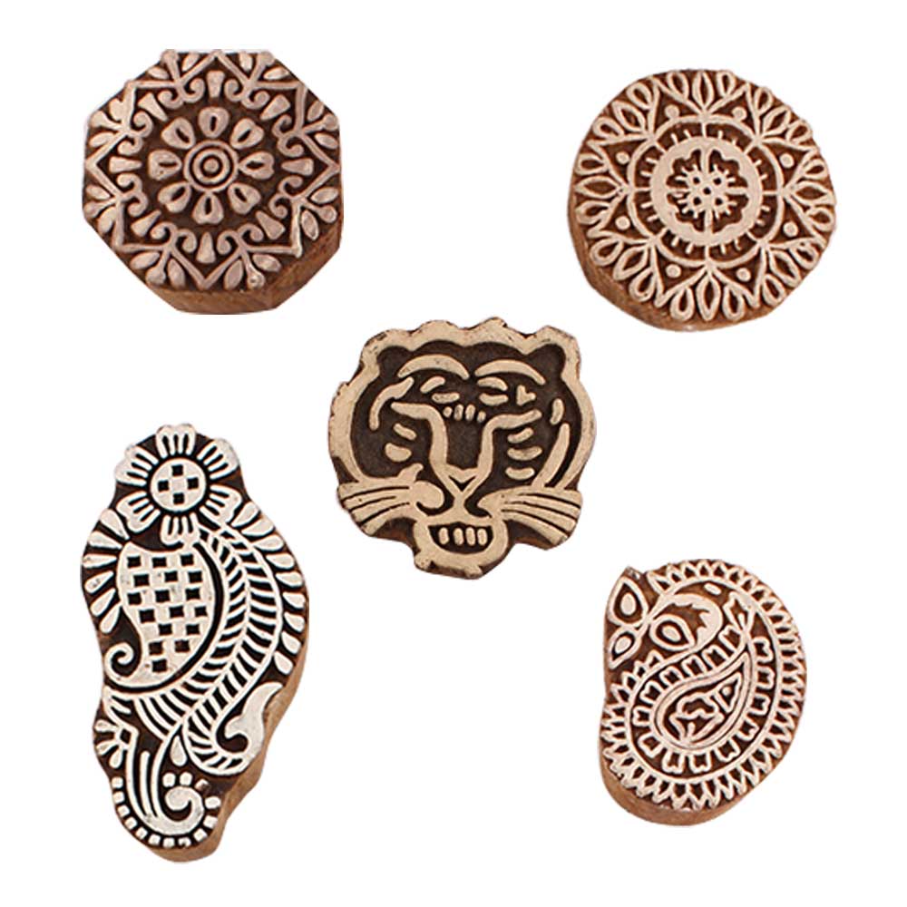 Set of 5 Piece New Mix Wooden Printing Blocks. Ideal for use on Fabric, Paper, Canvas, etc. These Blocks can be use to Print with Oil Colors, Fabric Colors, Water Colors, Acrylic Colors and Vegetable Colors.