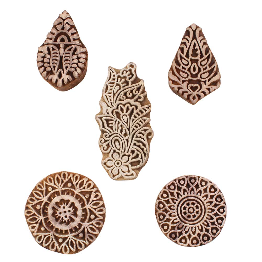 Set of 5 Piece New Mix Wooden Printing Blocks. Ideal for use on Fabric, Paper, Canvas, etc. These Blocks can be use to Print with Oil Colors, Fabric Colors, Water Colors, Acrylic Colors and Vegetable Colors.