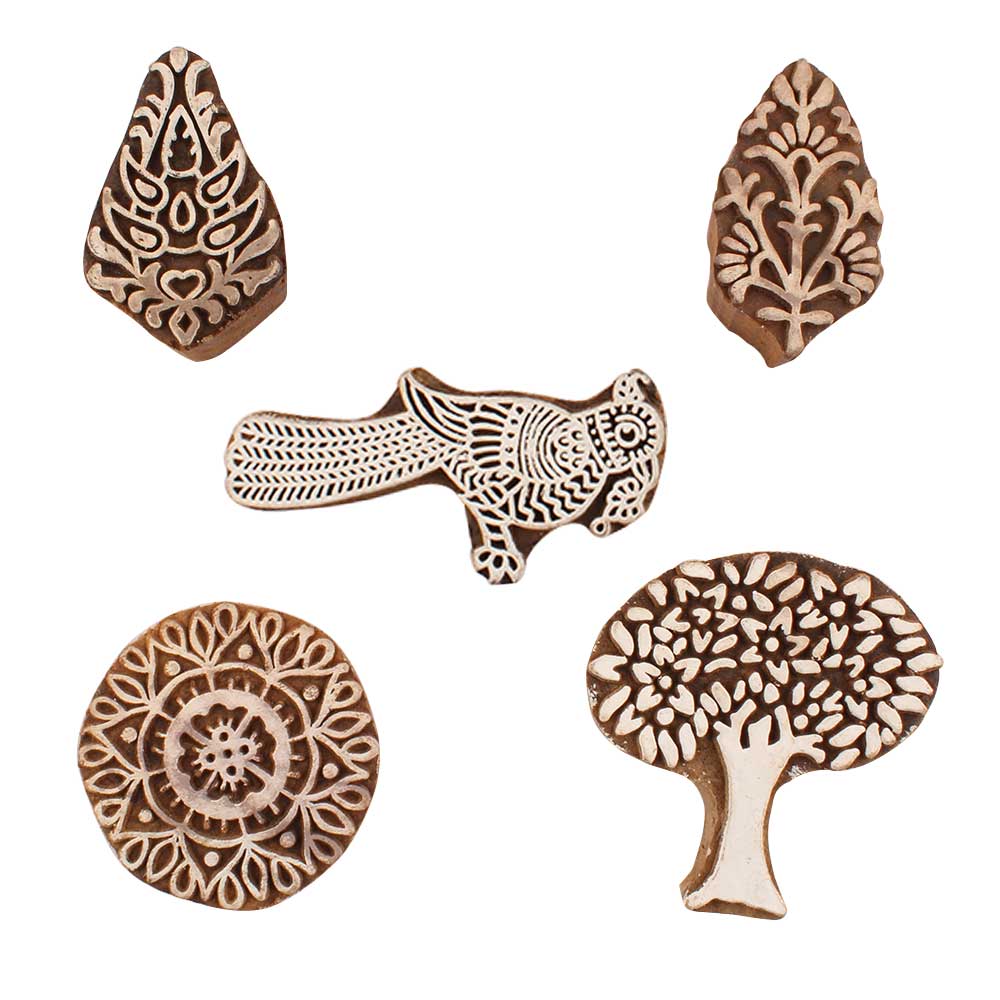 Set of 5 Piece New Mix Wooden Printing Blocks. Ideal for use on Fabric, Paper, Canvas, etc. These Blocks can be use to Print with Oil Colors, Fabric Colors, Water Colors, Acrylic Colors and Vegetable Colors.
