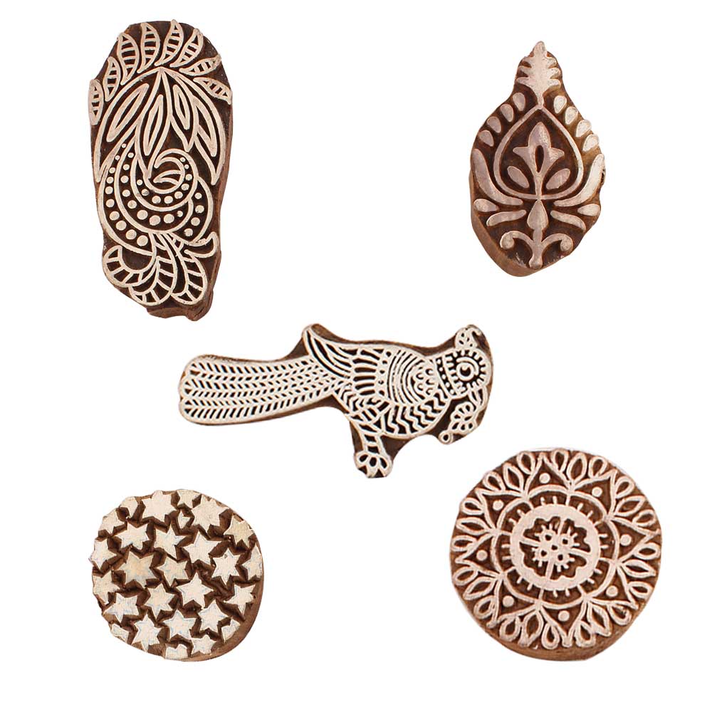 Set of 5 Piece New Mix Wooden Printing Blocks. Ideal for use on Fabric, Paper, Canvas, etc. These Blocks can be use to Print with Oil Colors, Fabric Colors, Water Colors, Acrylic Colors and Vegetable Colors.