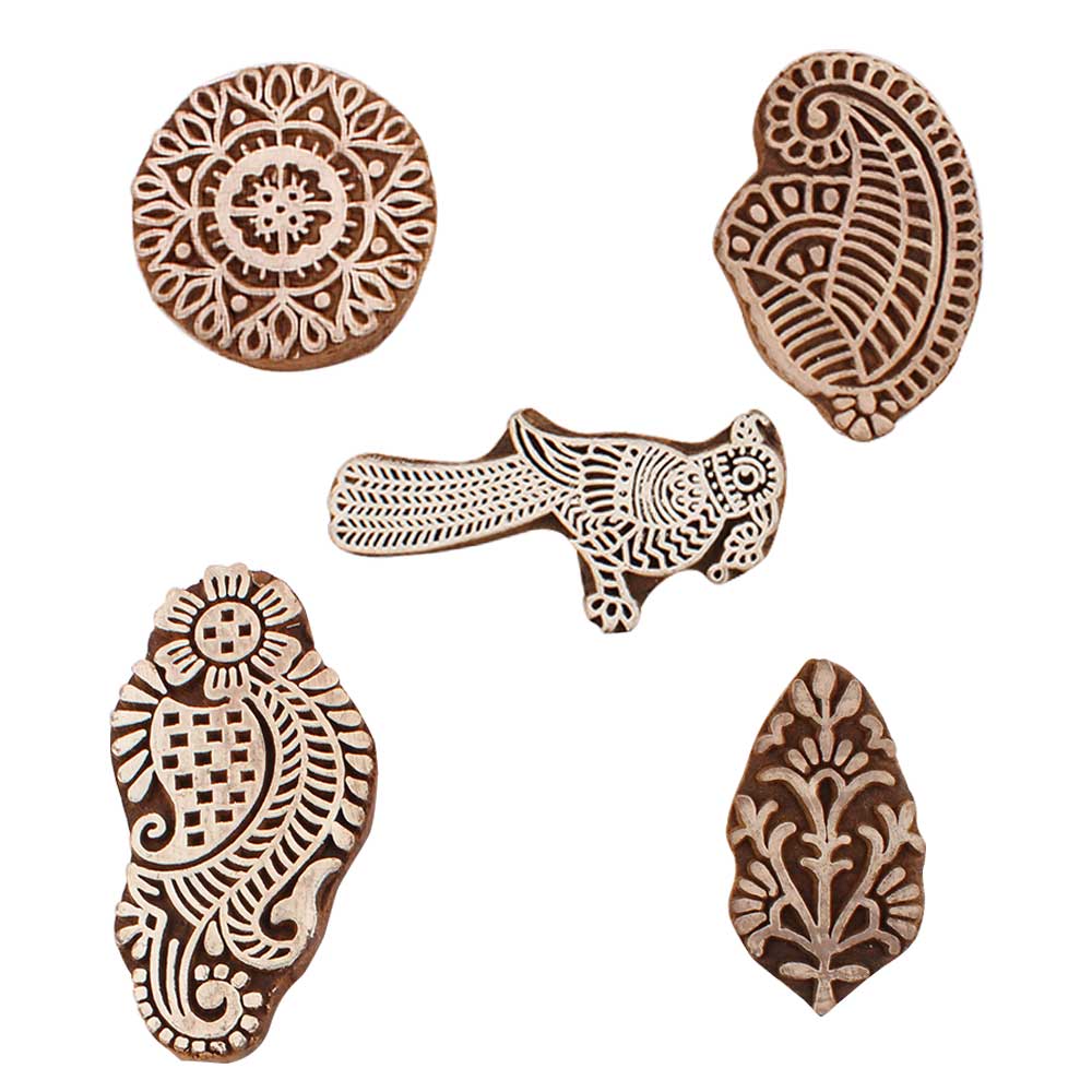 Set of 5 Piece New Mix Wooden Printing Blocks. Ideal for use on Fabric, Paper, Canvas, etc. These Blocks can be use to Print with Oil Colors, Fabric Colors, Water Colors, Acrylic Colors and Vegetable Colors.