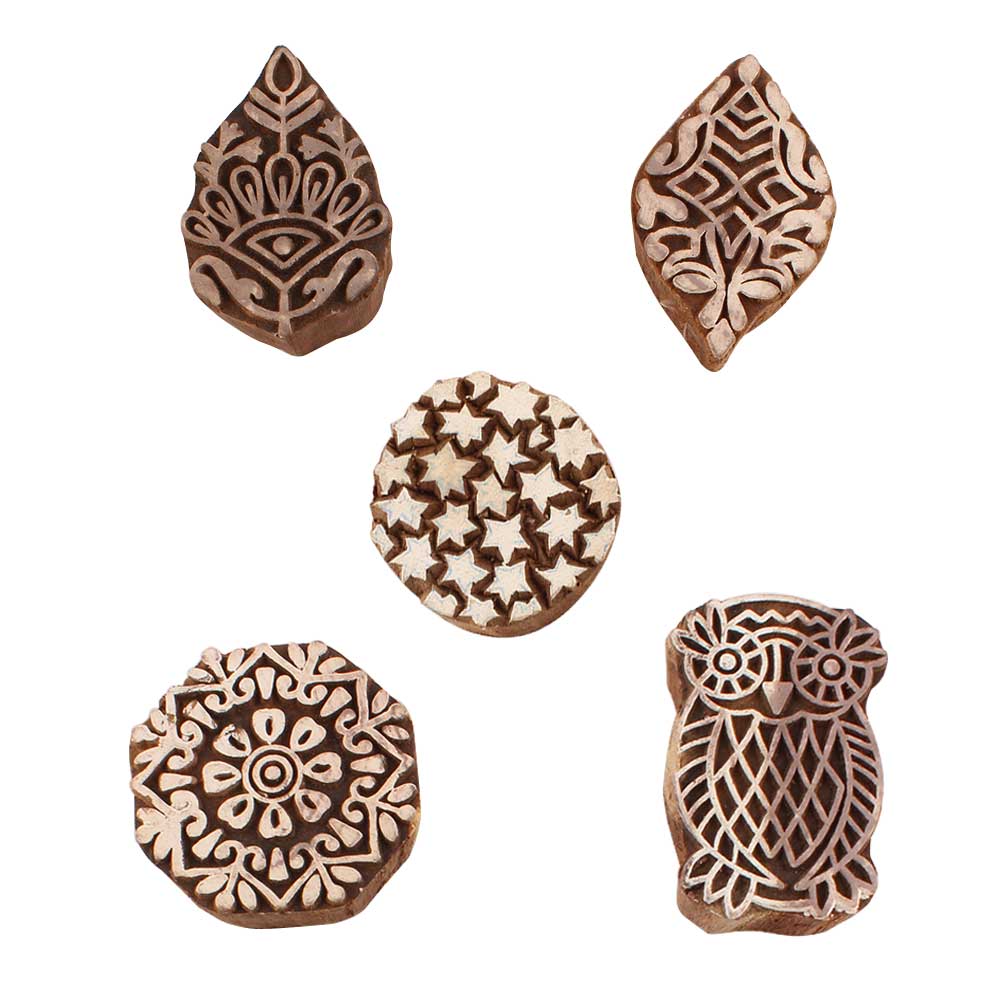 Set of 5 Piece New Mix Wooden Printing Blocks. Ideal for use on Fabric, Paper, Canvas, etc. These Blocks can be use to Print with Oil Colors, Fabric Colors, Water Colors, Acrylic Colors and Vegetable Colors.