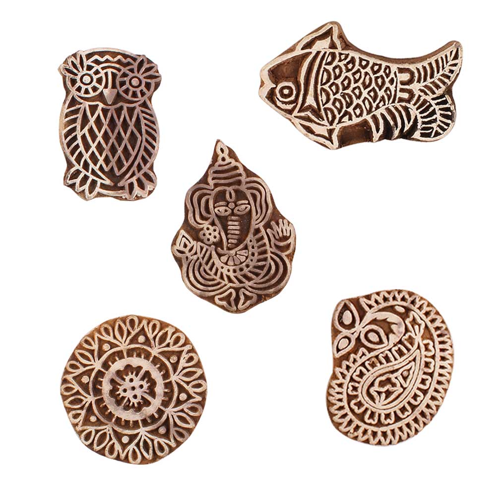 Set of 5 Piece New Mix Wooden Printing Blocks. Ideal for use on Fabric, Paper, Canvas, etc. These Blocks can be use to Print with Oil Colors, Fabric Colors, Water Colors, Acrylic Colors and Vegetable Colors.