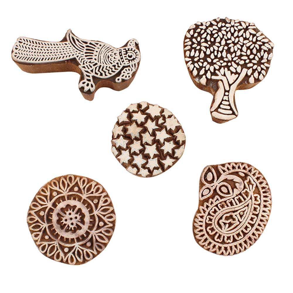 Set of 5 Piece New Mix Wooden Printing Blocks. Ideal for use on Fabric, Paper, Canvas, etc. These Blocks can be use to Print with Oil Colors, Fabric Colors, Water Colors, Acrylic Colors and Vegetable Colors.
