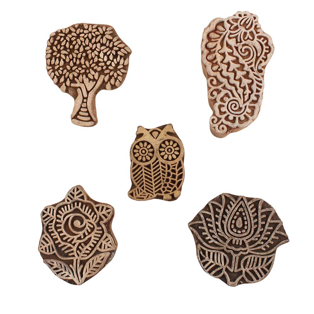 Set of 5 Piece New Mix Wooden Printing Blocks. Ideal for use on Fabric, Paper, Canvas, etc. These Blocks can be use to Print with Oil Colors, Fabric Colors, Water Colors, Acrylic Colors and Vegetable Colors.