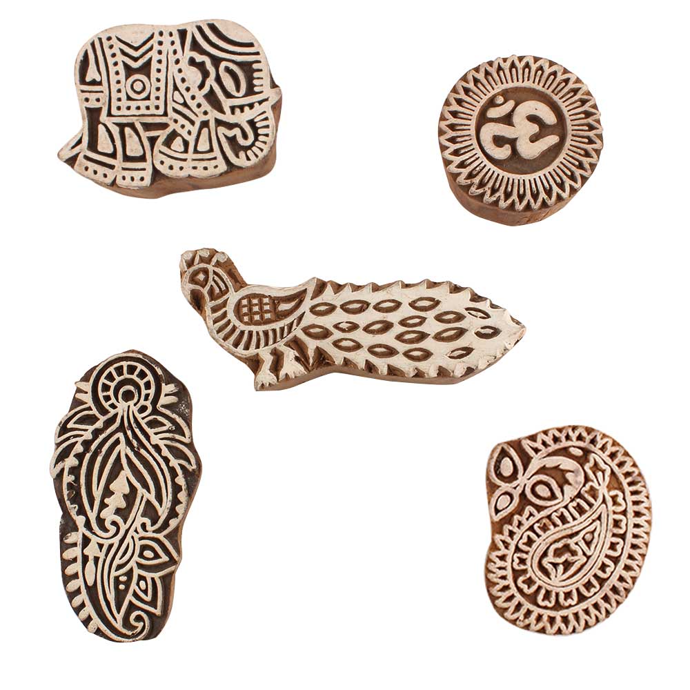 Set of 5 Piece New Mix Wooden Printing Blocks. Ideal for use on Fabric, Paper, Canvas, etc. These Blocks can be use to Print with Oil Colors, Fabric Colors, Water Colors, Acrylic Colors and Vegetable Colors.