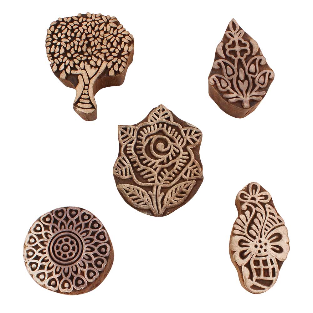 Set of 5 Piece New Mix Wooden Printing Blocks. Ideal for use on Fabric, Paper, Canvas, etc. These Blocks can be use to Print with Oil Colors, Fabric Colors, Water Colors, Acrylic Colors and Vegetable Colors.