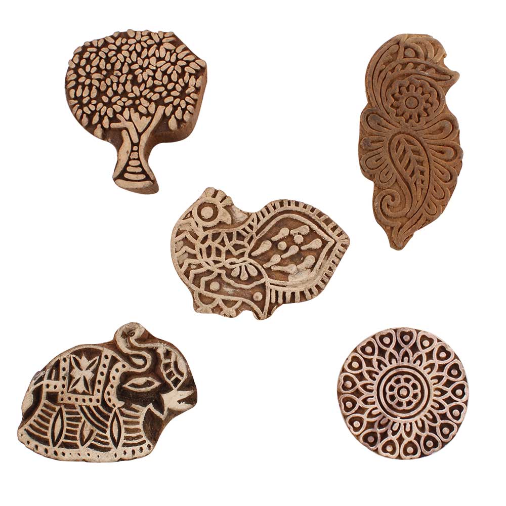 Set of 5 Piece New Mix Wooden Printing Blocks. Ideal for use on Fabric, Paper, Canvas, etc. These Blocks can be use to Print with Oil Colors, Fabric Colors, Water Colors, Acrylic Colors and Vegetable Colors.