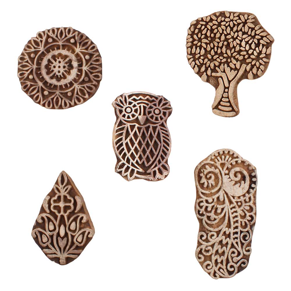 Set of 5 Piece New Mix Wooden Printing Blocks. Ideal for use on Fabric, Paper, Canvas, etc. These Blocks can be use to Print with Oil Colors, Fabric Colors, Water Colors, Acrylic Colors and Vegetable Colors.