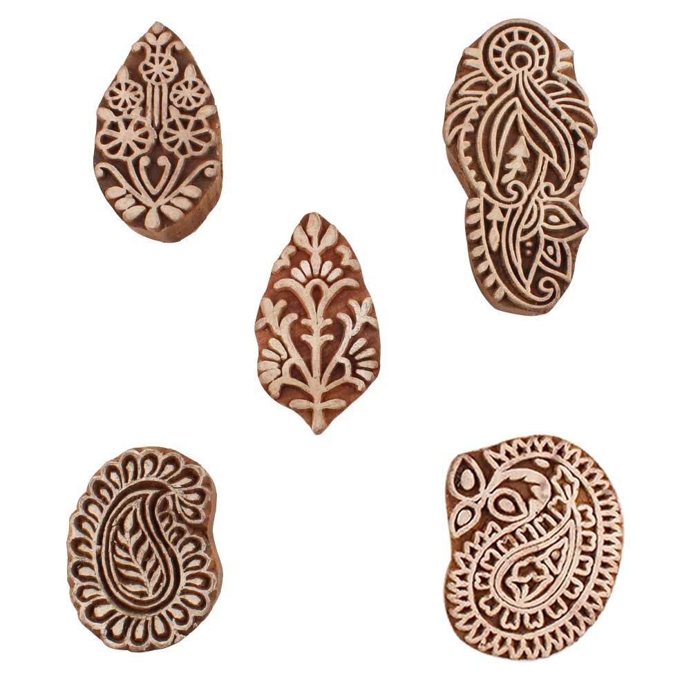 Set of 5 Piece New Mix Wooden Printing Blocks. Ideal for use on Fabric, Paper, Canvas, etc. These Blocks can be use to Print with Oil Colors, Fabric Colors, Water Colors, Acrylic Colors and Vegetable Colors.
