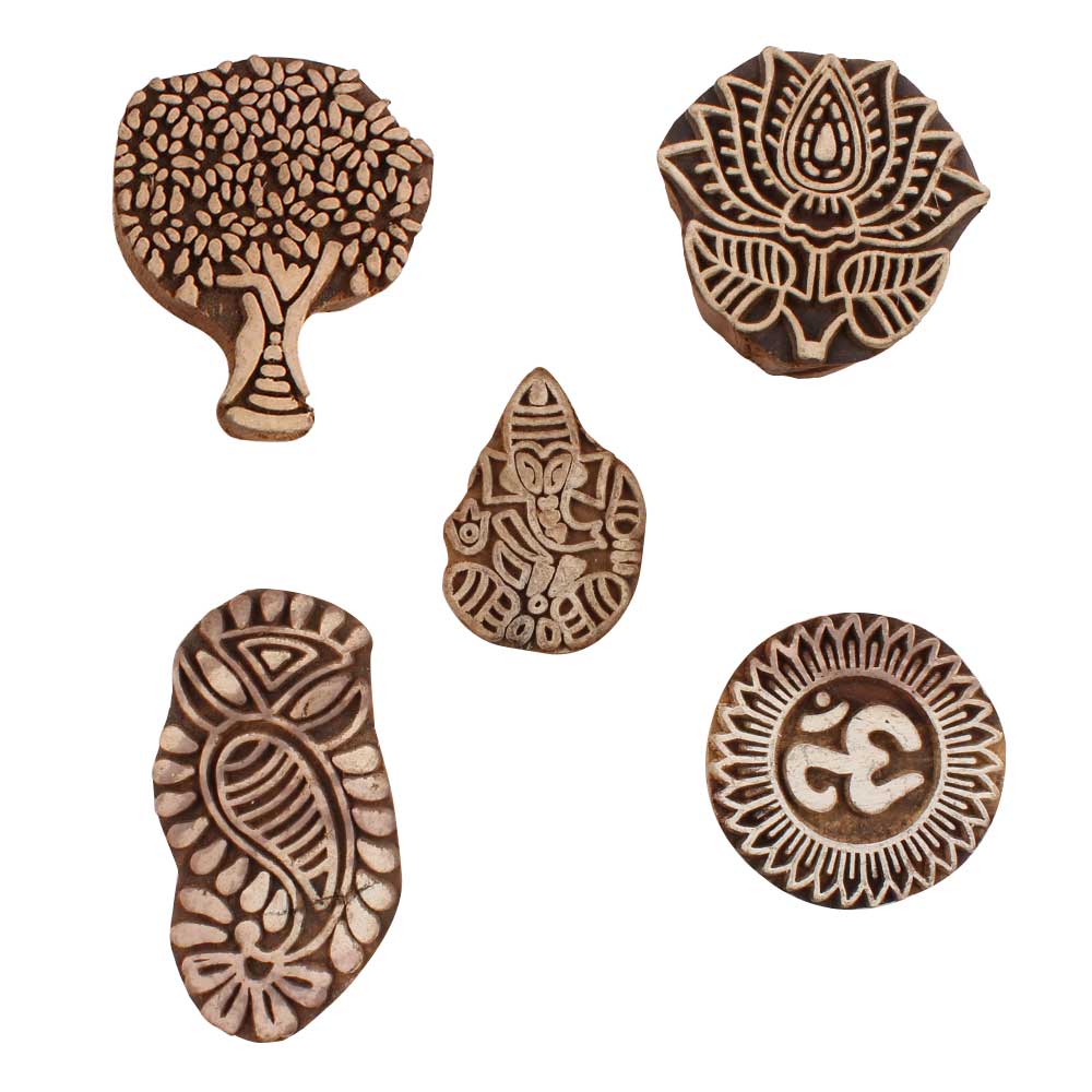 Set of 5 Piece New Mix Wooden Printing Blocks. Ideal for use on Fabric, Paper, Canvas, etc. These Blocks can be use to Print with Oil Colors, Fabric Colors, Water Colors, Acrylic Colors and Vegetable Colors.