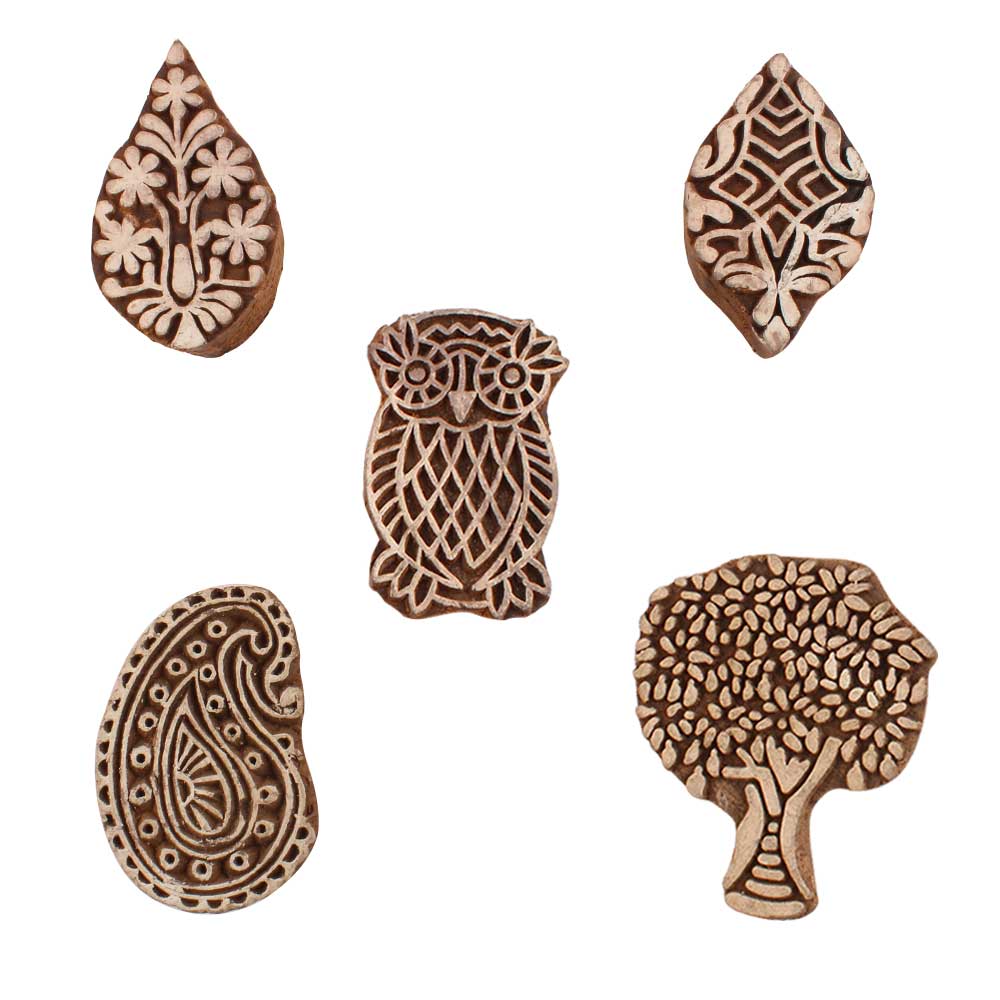 Set of 5 Piece New Mix Wooden Printing Blocks. Ideal for use on Fabric, Paper, Canvas, etc. These Blocks can be use to Print with Oil Colors, Fabric Colors, Water Colors, Acrylic Colors and Vegetable Colors.