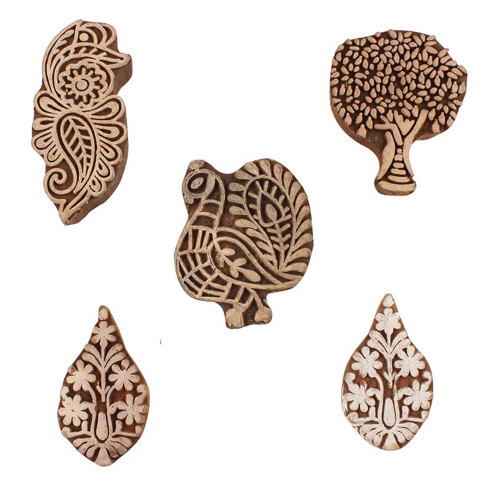 Set of 5 Piece New Mix Wooden Printing Blocks. Ideal for use on Fabric, Paper, Canvas, etc. These Blocks can be use to Print with Oil Colors, Fabric Colors, Water Colors, Acrylic Colors and Vegetable Colors.