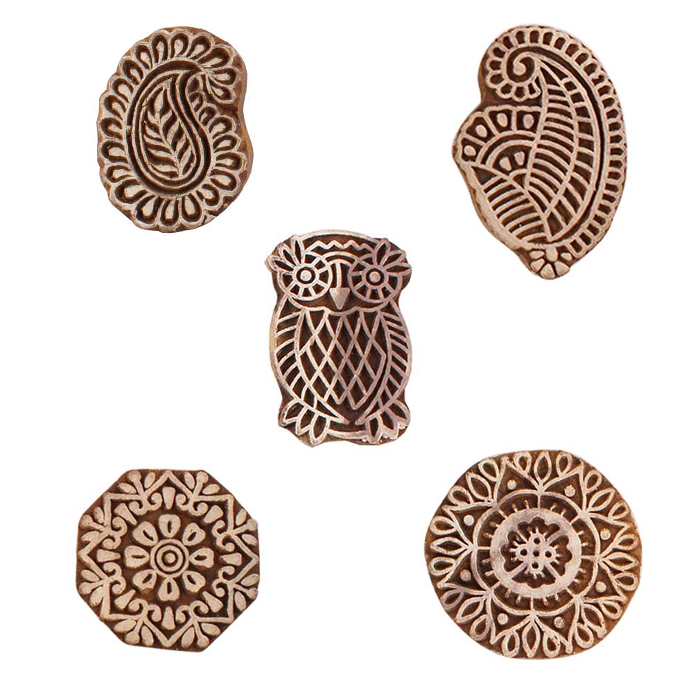 Set of 5 Piece New Mix Wooden Printing Blocks. Ideal for use on Fabric, Paper, Canvas, etc. These Blocks can be use to Print with Oil Colors, Fabric Colors, Water Colors, Acrylic Colors and Vegetable Colors.