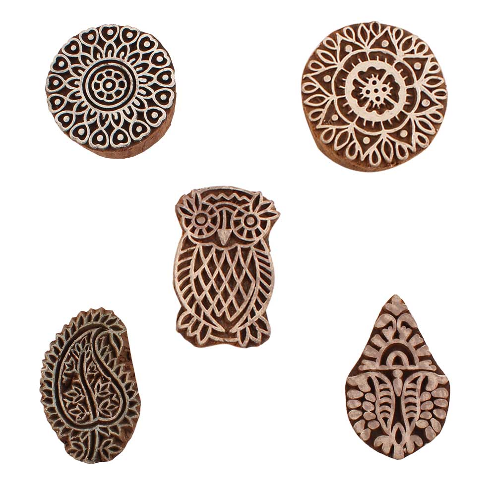 Set of 5 Piece New Mix Wooden Printing Blocks. Ideal for use on Fabric, Paper, Canvas, etc. These Blocks can be use to Print with Oil Colors, Fabric Colors, Water Colors, Acrylic Colors and Vegetable Colors.
