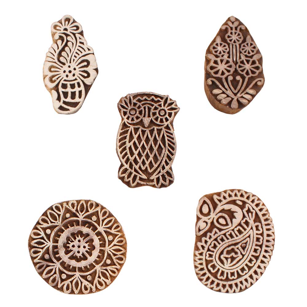 Set of 5 Piece New Mix Wooden Printing Blocks. Ideal for use on Fabric, Paper, Canvas, etc. These Blocks can be use to Print with Oil Colors, Fabric Colors, Water Colors, Acrylic Colors and Vegetable Colors.
