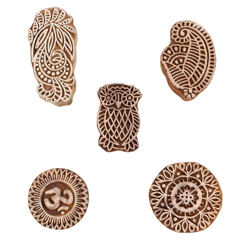 Set of 5 Piece New Mix Wooden Printing Blocks. Ideal for use on Fabric, Paper, Canvas, etc. These Blocks can be use to Print with Oil Colors, Fabric Colors, Water Colors, Acrylic Colors and Vegetable Colors.
